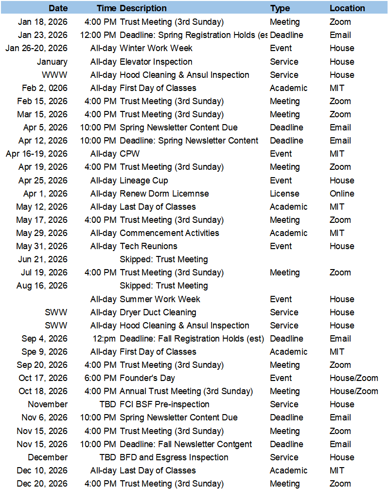 Calendar of Events